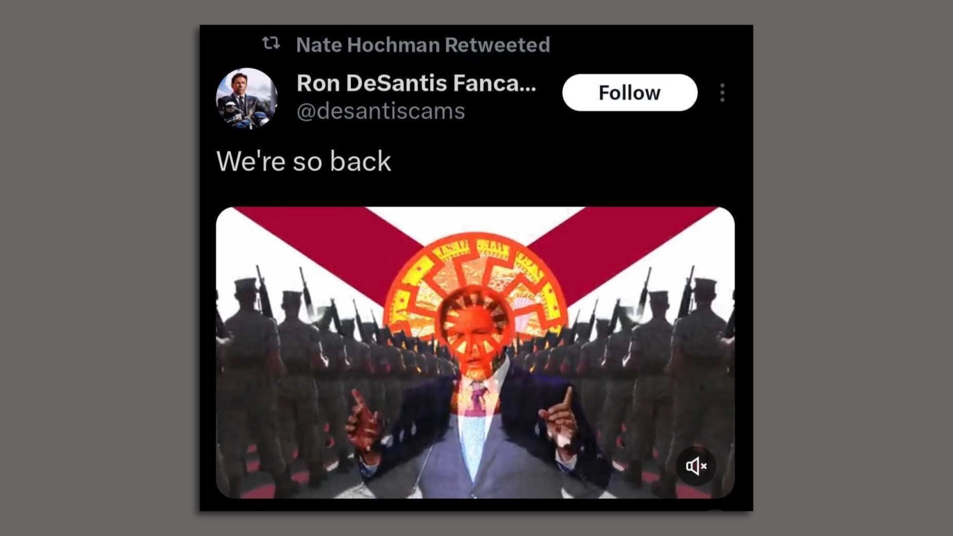 The video hyped up DeSantis to the tune of Kate Bush's "Running up that Hill (A Deal with God)," and ended with an image of DeSantis in the center of Florida's state seal — which then morphs into a rotating Sonnenrad.